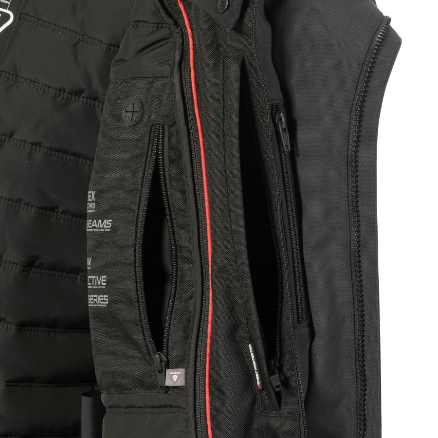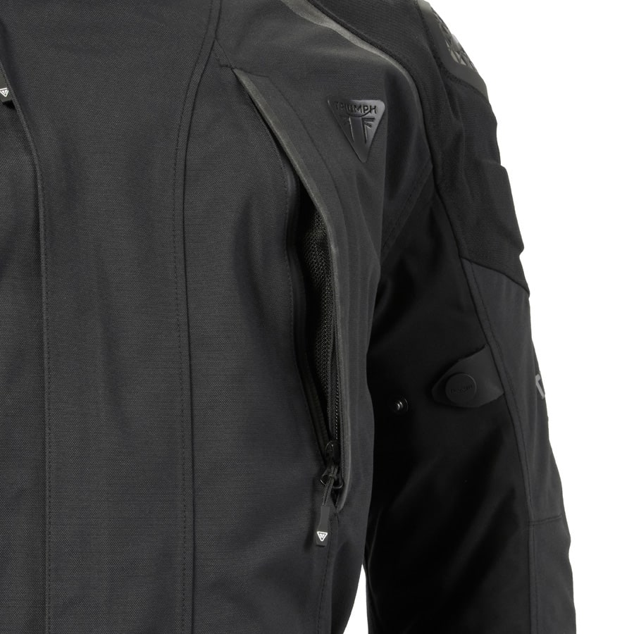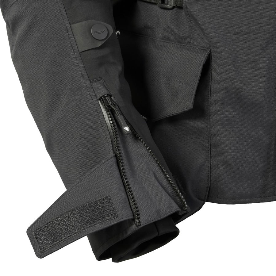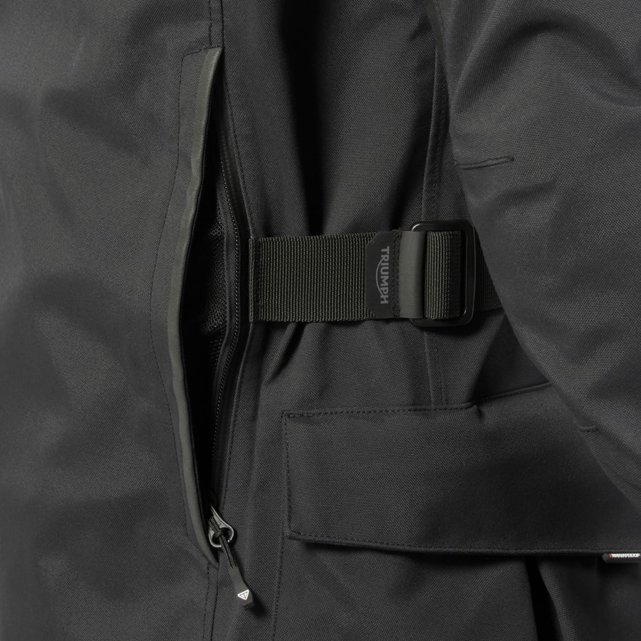 Water resistant zipper pocket at lower left sleeve, ideal for quick access to pass cards or small essentials